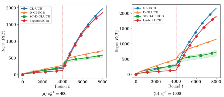 Contextual sequential decision problems with categorical or numerical observations are ubiquitous and Generalized Linear Bandits (GLB) offer a solid theoretical framework to address them. In contrast to the case of linear bandits, existing algorithms for GLB have two draw- backs undermining their applicability. First, they rely on excessively pessimistic concentration bounds due to the non-linear nature of the model. Second, they require either non-convex projection steps or burn-in phases to enforce boundedness of the estimators. Both of these issues are worsened when considering non-stationary models, in which the GLB parameter may vary with time. In this work, we focus on self-concordant GLB (which include logistic and Poisson regression) with forgetting achieved either by the use of a sliding window or exponential weights. We propose a novel confidence-based algorithm for the maximum-likehood estimator with forgetting and analyze its perfomance in abruptly changing environments. These results as well as the accompanying numerical simulations highlight the potential of the proposed approach to address non-stationarity in GLB.